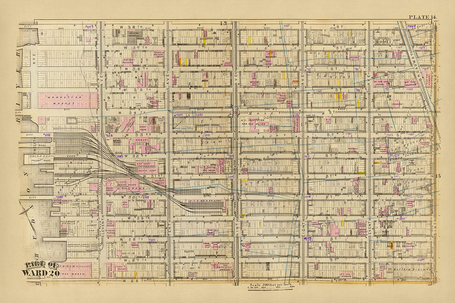 Mapa antiguo del distrito 20, Nueva York, 1879: Garment District, New York Central y Hudson River Freight Yard, Manhattan Market, Acuario de Nueva York