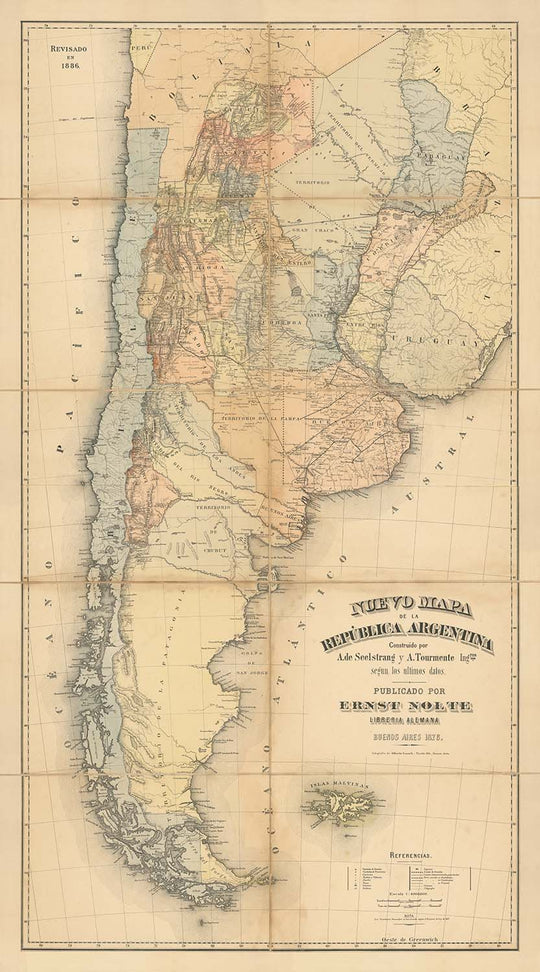 El "Nuevo Mapa de la República Argentina," elaborado por las hábiles manos de A. de Seelstrang y A. Tourmente y publicado por Ernst Nolte, es un logro cartográfico notable de 1886. Este mapa captura un período transformador en la historia argentina, cuando la nación estaba floreciendo con crecimiento e influencia europea. Delinea elegantemente los paisajes políticos y físicos de Argentina y el sur de Chile, proporcionando una ventana a una época en la que el país estaba expandiendo sus territorios e infraestructura. El mapa es un testimonio de las ambiciones de Argentina y su identidad en evolución como una nación de oportunidades.
