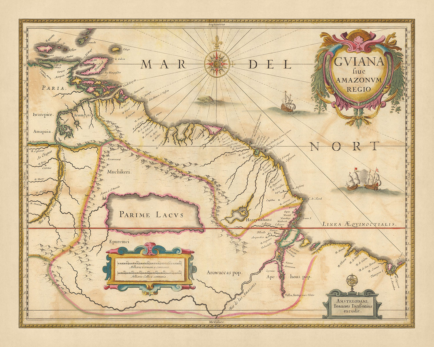 Mapa antiguo de Guayana el Amazonas por Nicolaes Visscher II, 1690: Trinidad y Tobago, Surinam, Amapá, Pará, Guyana
