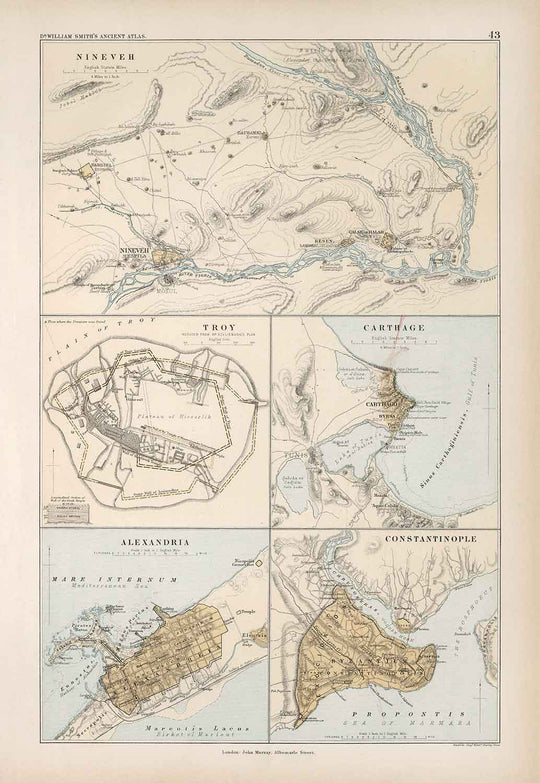 Este mapa de plan de ciudad cubre cinco grandes y antiguas ciudades en África del Norte y el Medio Oriente: Constantinopla, ahora conocida como Estambul, Alejandría, Cartago, Troya, conocida hoy como Hisarlik y Nínive, conocida hoy como Mosul.