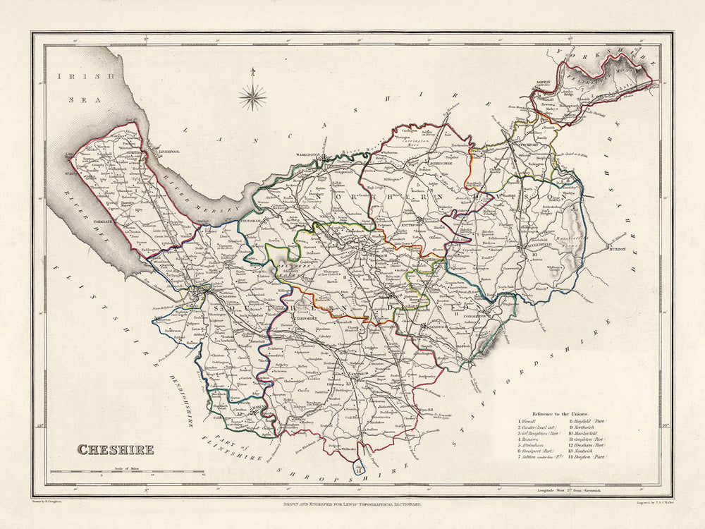 Sumérgete en la rica historia y belleza del condado de Cheshire con este mapa auténtico y detalladamente elaborado de 1844, creado por el renombrado cartógrafo Samuel Lewis. Este tesoro histórico no solo sirve como una pieza artística de interés, sino también como una instantánea de una época en la que las ciudades estaban surgiendo y la cara de Inglaterra estaba evolucionando rápidamente. Descubre los fundamentos de los asentamientos modernos, muchos de los cuales se han transformado en bulliciosas metrópolis de hoy, aunque algunos podrían no estar en este mapa, o emocionantemente, podrían estar representados bajo un nombre anterior.