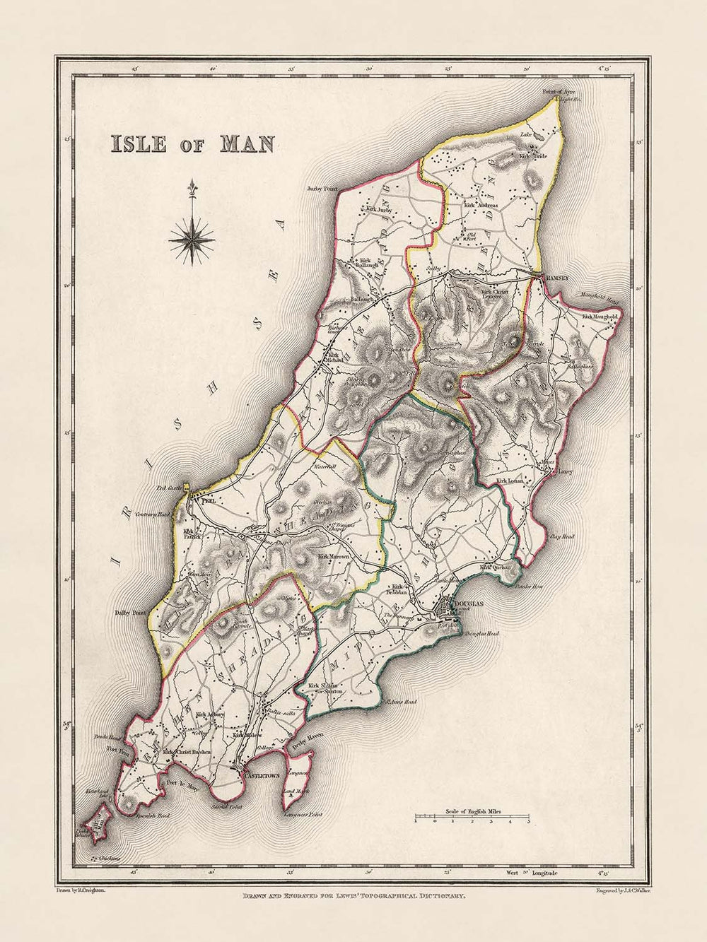 Antigua mapa de la Isla de Man por Samuel Lewis, 1844: Douglas, Ramsey, Peel, Castletown y Port Erin