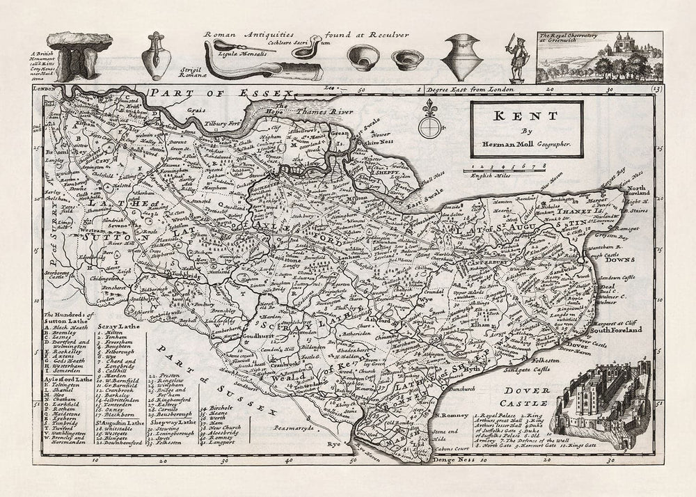 Los mapas del condado de Moll están adornados con vistas interesantes y curiosidad, en este caso, en este caso, un grabado detallado del castillo de Dover en la parte inferior derecha, algunas antigüedades romanas aparentemente se encuentran en la reclinación, y un boceto encantador del Observatorio Greenwich.
