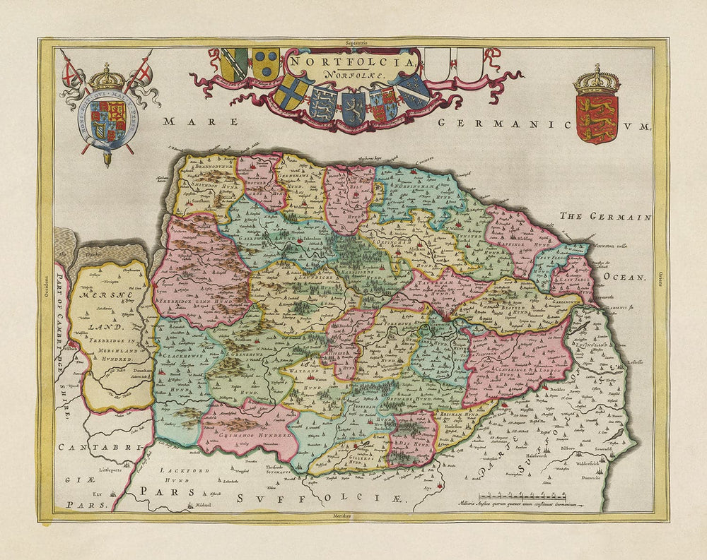 La mayoría de las ciudades y pueblos más poblados de Norfolk ya habían surgido en los años 1600. Aquí hay algunos de los lugares claramente visibles en este antiguo mapa del condado de Norfolk: Norwich, King's Lynn, Gorleston-on-Sea, Great Yarmouth, Thetford, Dereham, Taverham, Wymondham, North Walsham, Downham Market, Attleborough, Diss, Caister, Hunstanton, Sheringham, Cromer, Fakenham y muchos más. Pero, por supuesto, muchos de ellos están escritos en sus formas de inglés moderno temprano.