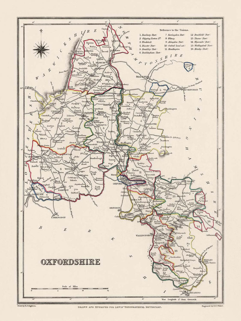 Este mapa exquisitamente detallado y rico en historia de Oxfordshire de 1844, del notable cartógrafo Samuel Lewis, proporciona una fascinante instantánea de uno de los condados más históricos de Inglaterra durante un período de inmenso cambio social e industrial. Cada línea dibujada a mano y cada nombre grabado meticulosamente cuentan la historia de un tiempo y un lugar que sentaron las bases de la moderna Oxfordshire que conocemos hoy. Cada asentamiento, desde la aldea más pequeña hasta la ciudad más grande, ofrece una ventana al pasado, algunos de los cuales han crecido hasta convertirse en ciudades modernas, mientras que otros han permanecido encantadoramente inalterados a lo largo de los siglos.