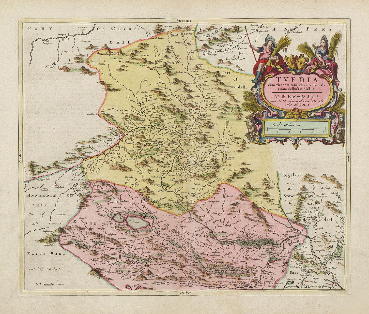 Este mapa antiguo de colores completos, extremadamente raro, del condado de Selkirk en Escocia fue creado por el maestro cartógrafo Joan Blaeu desde su taller en Ámsterdam y publicado originalmente en 1665 como parte de su Theatrum Orbis Terrarum Sive Atlas Novus.