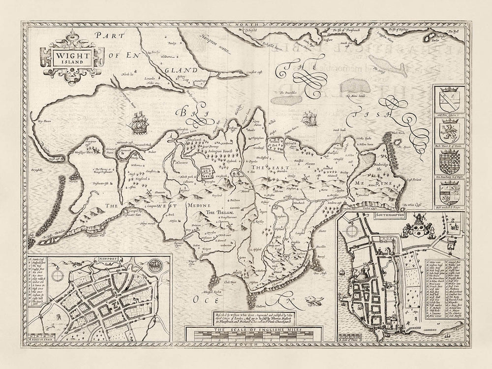 Antiguo mapa monocromo de la Isla de Wight, 1611 por John Speed: Newport, Ride, Cowes, Sandown, Shanklin, Southampton