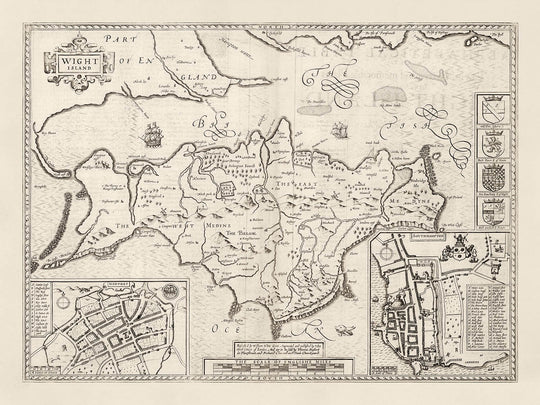 Esta antigua y maravillosa mapa, en su original blanco y negro monocromo, muestra el antiguo condado de la Isla de Wight (o Isla de Wight como se conocía entonces) en 1611. Fue creado por John Speed y grabado por Jodocus Hondius, y publicado originalmente en "El Teatro del Imperio de Gran Bretaña" de Speed.