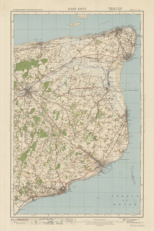 Este mapa antiguo, titulado "Hoja 117 - East Kent", es una pieza notable de la edición "Popular" de una pulgada de Ordnance Survey, Inglaterra y Gales, publicada en 1925. El mapa muestra el condado histórico de East Kent, que está situado en la parte sureste de Inglaterra. Cuenta con varios pueblos y ciudades destacados y cautivadores paisajes naturales que lo convierten en una adición fascinante a cualquier pared.