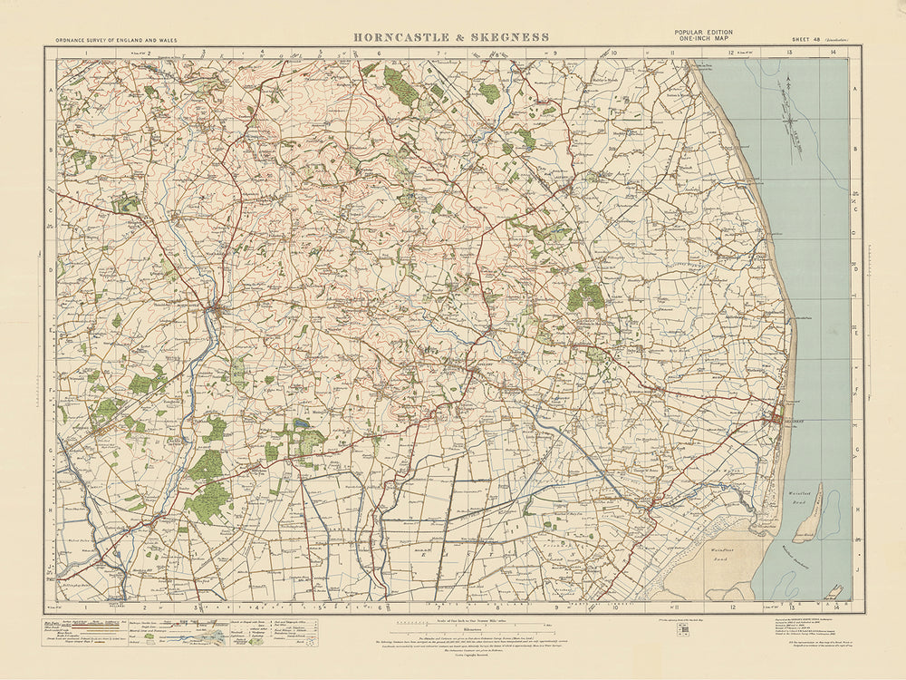 Este antiguo mapa de Ordnance Survey, Hoja 48 - Horncastle & Skegness, de la edición "Popular" de una pulgada, Inglaterra y Gales, publicada en 1925, ofrece una visión fascinante del pasado. El mapa muestra las ciudades de Horncastle y Skegness, junto con varios otros asentamientos y características notables en el área circundante. Proporciona un valioso recurso histórico, capturando un momento específico en el tiempo y permitiéndonos explorar el paisaje tal como era hace casi un siglo.