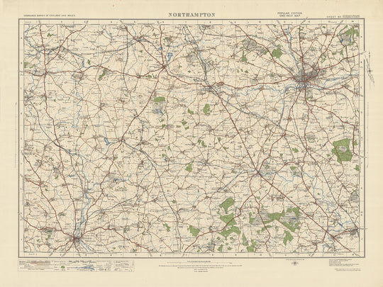 Este antiguo mapa de Ordnance Survey, Hoja 83 - Northampton, es una pieza fascinante de la historia cartográfica de la edición "Popular" de una pulgada de Inglaterra y Gales, publicada en 1925. El mapa muestra el condado histórico de Northamptonshire, centrándose en el la propia ciudad de Northampton, junto con varios otros pueblos, ciudades y características interesantes notables.