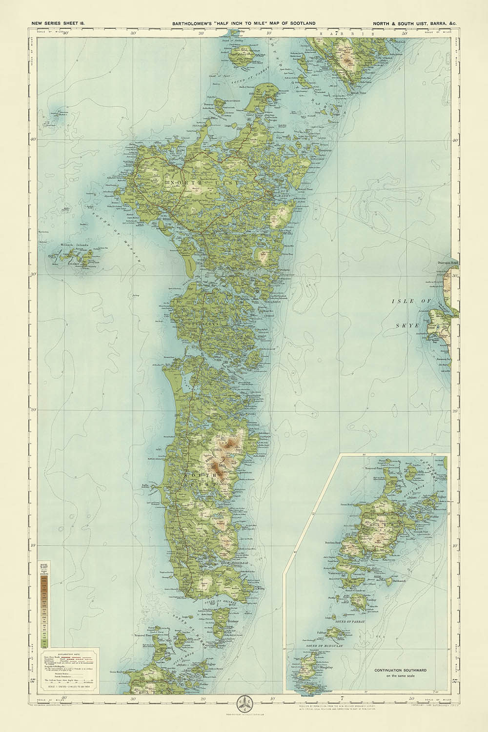 El estilo distintivo de Bartholomew es evidente en el diseño del mapa, que utiliza una sutil gradación de bandas de color para representar el relieve del paisaje. Esta técnica innovadora permite a los espectadores apreciar la variada topografía de North y South Uist, desde los escarpados picos de Hecla y Beinn Mhor hasta las serenas aguas de Lochmaddy y Lochboisdale. La orientación vertical del mapa realza aún más su atractivo visual, ofreciendo una representación clara y atractiva de la geografía de las islas.