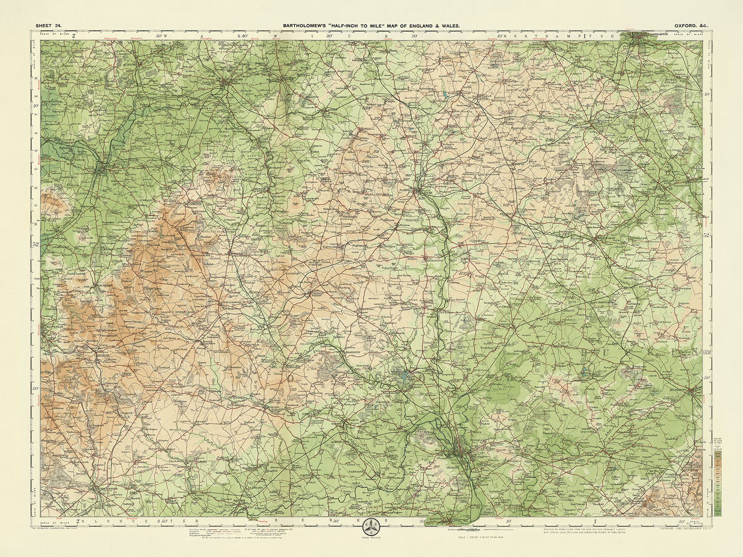 La hoja 24 - Oxford, creada por el ilustre JG Bartholomew en 1901, es una pieza cautivadora de la historia cartográfica. Este mapa, parte de la serie insignia de Bartholomew de media pulgada por milla, ofrece una representación detallada y colorida de la región de Oxford, convirtiéndolo en un artefacto apreciado tanto por los entusiastas de la historia como por los coleccionistas de mapas. Bartholomew, un renombrado cartógrafo escocés, fue celebrado por su enfoque innovador en el diseño de mapas, y este mapa en particular ejemplifica su maestría. La meticulosa gradación de bandas de color para representar el relieve del paisaje es un testimonio de su habilidad, proporcionando una representación vívida y matizada del terreno.