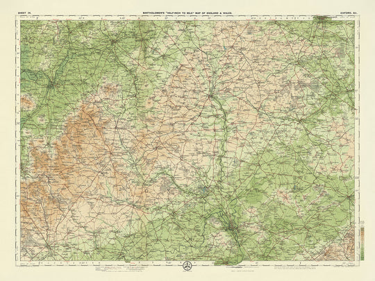 Históricamente, este mapa es significativo ya que refleja el creciente interés en los viajes recreativos y el ciclismo durante principios de 1900. El trabajo de Bartholomew no solo proporcionó herramientas de navegación prácticas, sino que también inspiró la exploración y la aventura. La representación detallada y precisa del paisaje lo convirtió en un compañero esencial para los viajeros de la época. Hoy en día, sirve como un valioso documento histórico, ofreciendo perspectivas sobre la geografía, infraestructura y monumentos culturales de la región de Oxford hace más de un siglo.