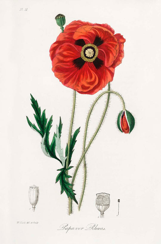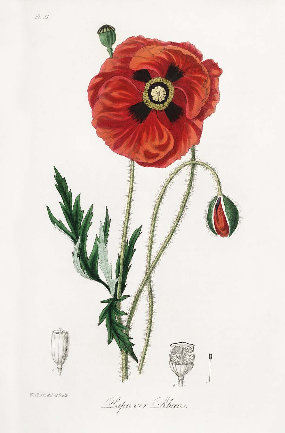 Papaver rhoeas, para darle su nombre en latín, fue grabado por William Clark para Botánica Médica, un libro épico publicado por los notables naturalistas y botánicos John Stephenson y James Morss Churchill.