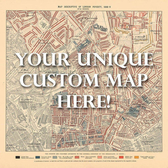 Crea y posee un mapa histórico personalizado y único del Mapa de la Pobreza de Londres, creado por Charles Booth en 1898-99. Puedes pedir un mapa cuadrado, en retrato o en paisaje.