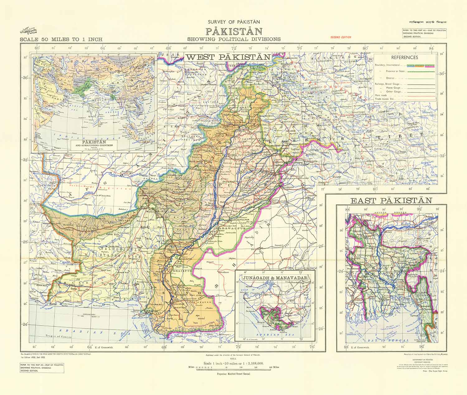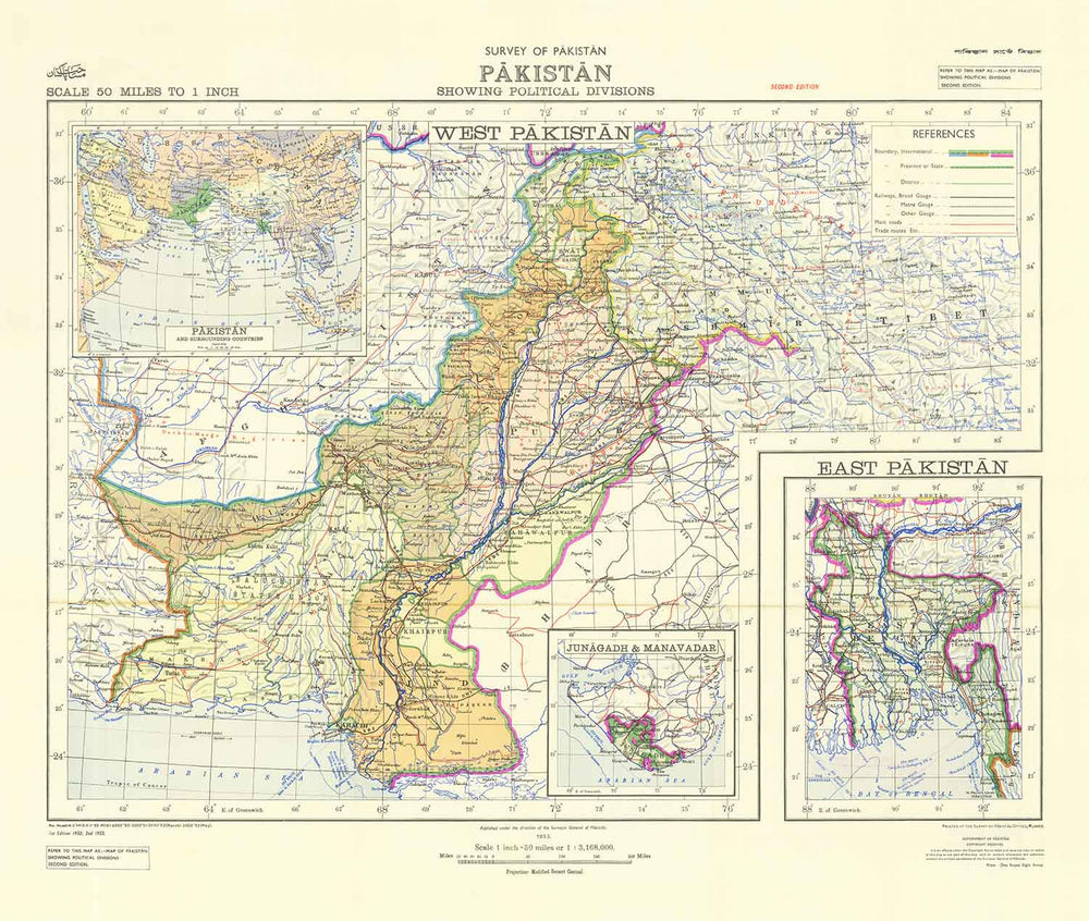 Primer mapa de Pakistán, 1953: Antiguo mapa del Oeste y el Este independientes