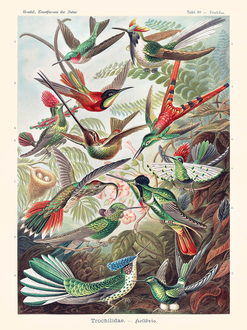 Ernst Haeckel, conocido por sus contribuciones a la biología y el naturalismo, fue un destacado científico y artista alemán. Su trabajo cerró la brecha entre el arte y la ciencia, haciendo que conceptos biológicos complejos fueran accesibles y visualmente atractivos. La ilustración "Colibríes" es parte del cuerpo de trabajo más amplio de Haeckel, Formas de Arte en la Naturaleza, que ha sido celebrado por su belleza estética y precisión científica.