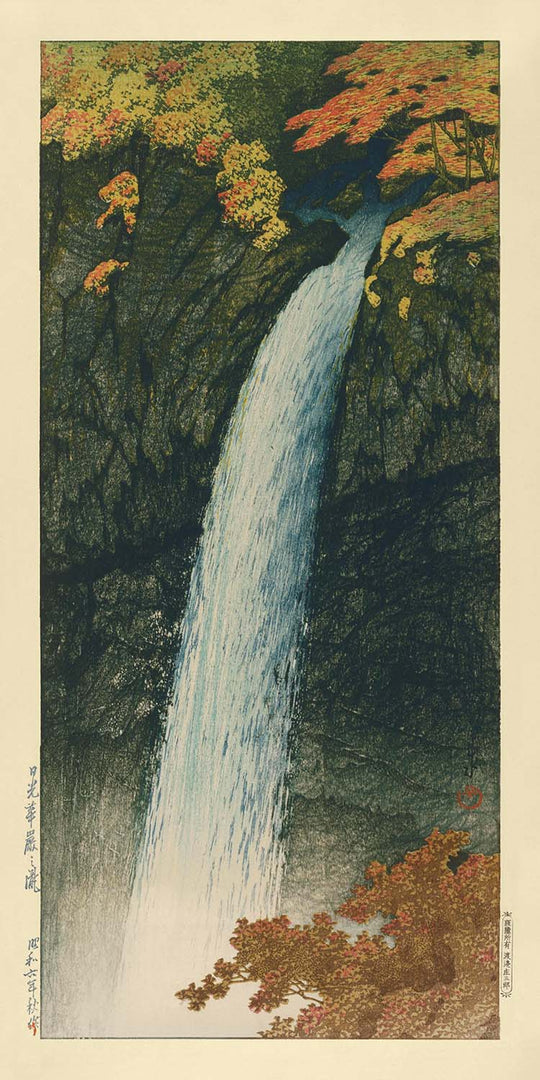 Hasui Kawase, celebrado por su habilidad inigualable para capturar la esencia de los paisajes japoneses, da vida a la Cascada Kegon con su estilo característico. Esta impresión subraya su maestría en la representación del agua, el movimiento y la atmósfera, cualidades que le valieron renombre tanto en Japón como en el extranjero. El uso de verdes exuberantes en esta obra atrae al espectador a su entorno tranquilo, armonizando con los suaves amarillos para acentuar las aguas en cascada y los alrededores verdes.