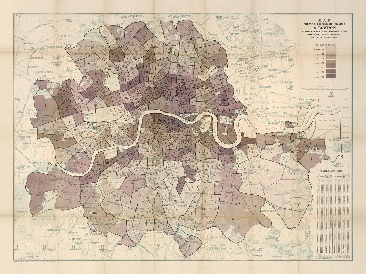Este antiguo y extremadamente raro mapa muestra la vista agregada del monumental trabajo de Charles Booth a finales del siglo XIX para medir el nivel de pobreza de aproximadamente 4 millones de residentes del centro de Londres.