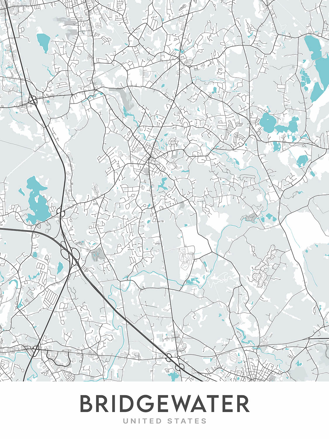 Este mapa de Bridgewater es una celebración de la cartografía y el diseño modernos. Con sus líneas limpias y colores apagados, este mapa agregará un toque de sofisticación a cualquier hogar u oficina. El mapa se centra en la ciudad de Bridgewater en Massachusetts y se extiende aproximadamente 9 millas al norte del centro de la ciudad, 9 millas al sur, 7,5 millas al este y 7,5 millas al oeste. Esto abarca la totalidad de la ciudad de Bridgewater, así como partes de las ciudades vecinas de Raynham, Easton, Whitman, Brockton y Halifax.