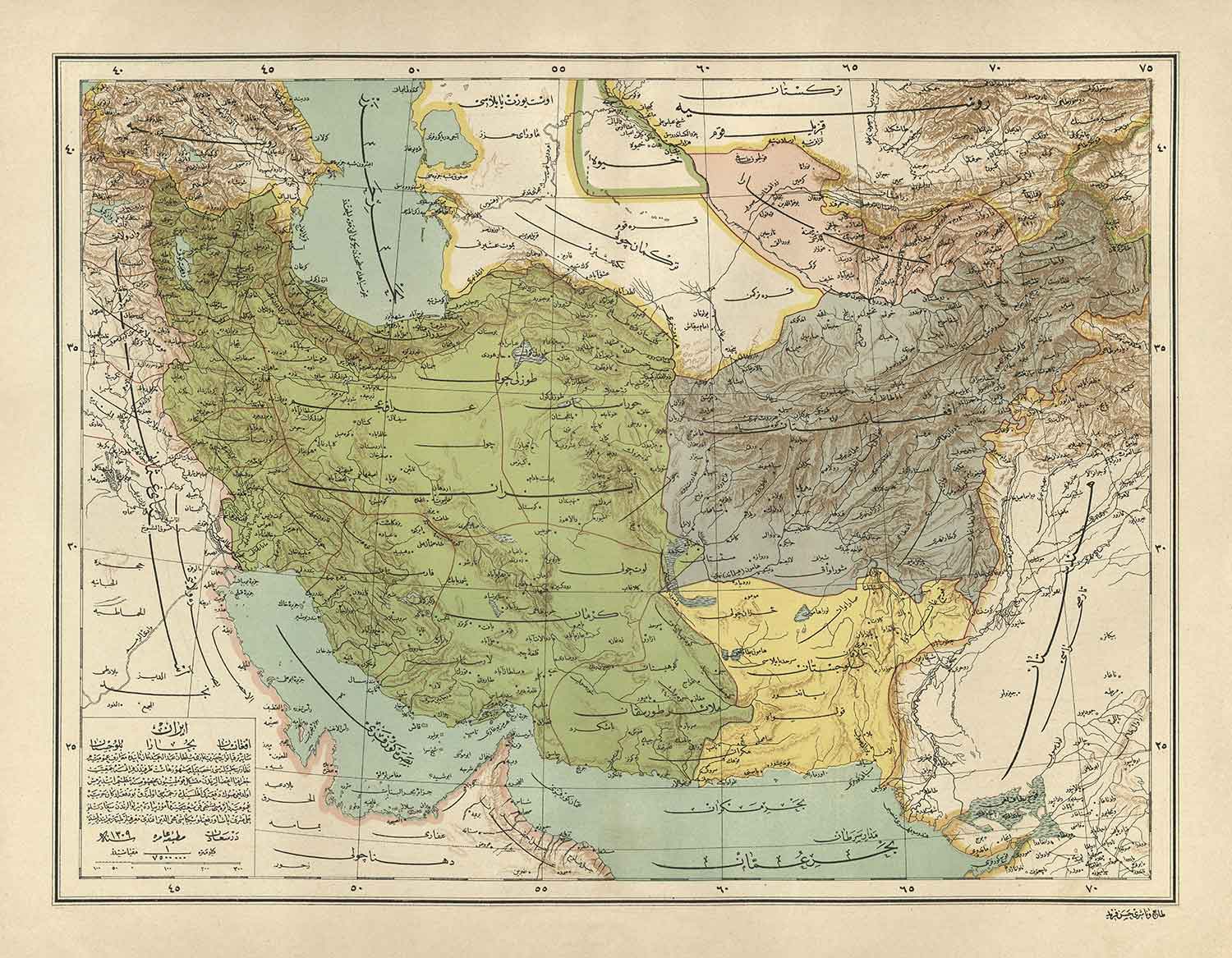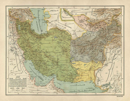 Antiguo mapa árabe de Irán, Pakistán, Afganistán y Uzbekistán en 1891: Arabia, Kuwait, Golfo Pérsico, Mar Caspio, URSS