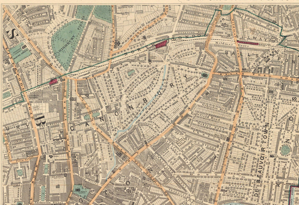 El mapa se publicó originalmente en 24 hojas. En total, el mapa habría medido aproximadamente 2 metros de ancho (78 pulgadas). Este aquí es la hoja 7, que se centra en las partes del centro de la ciudad de los distritos modernos de Islington y Hackney.