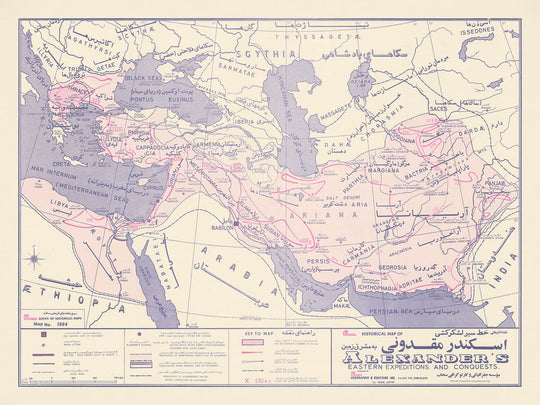 Adéntrate en el mundo de las antiguas conquistas con este exquisito mapa del Imperio de Alejandro Magno, meticulosamente elaborado por el Instituto Sahab de Geografía y Dibujo en 1972. Este mapa históricamente informativo captura la esencia de las expediciones orientales de Alejandro, trazando sus legendarias rutas desde Grecia hasta el Punjab. El mapa detalla vívidamente las campañas militares estratégicas que expandieron su imperio, mostrando las rutas tomadas por Alejandro, Cráter y Nearchus. Cada camino es un testimonio de la audacia y ambición que definieron a uno de los conquistadores más renombrados de la historia.