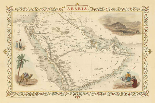 Grabado por John Rapkin y publicado por J. Tallis & Co en 1851, este es uno de los mapas históricos más finos y detallados de la Península Arábiga, o simplemente "Arabia" como se conocía en ese entonces.