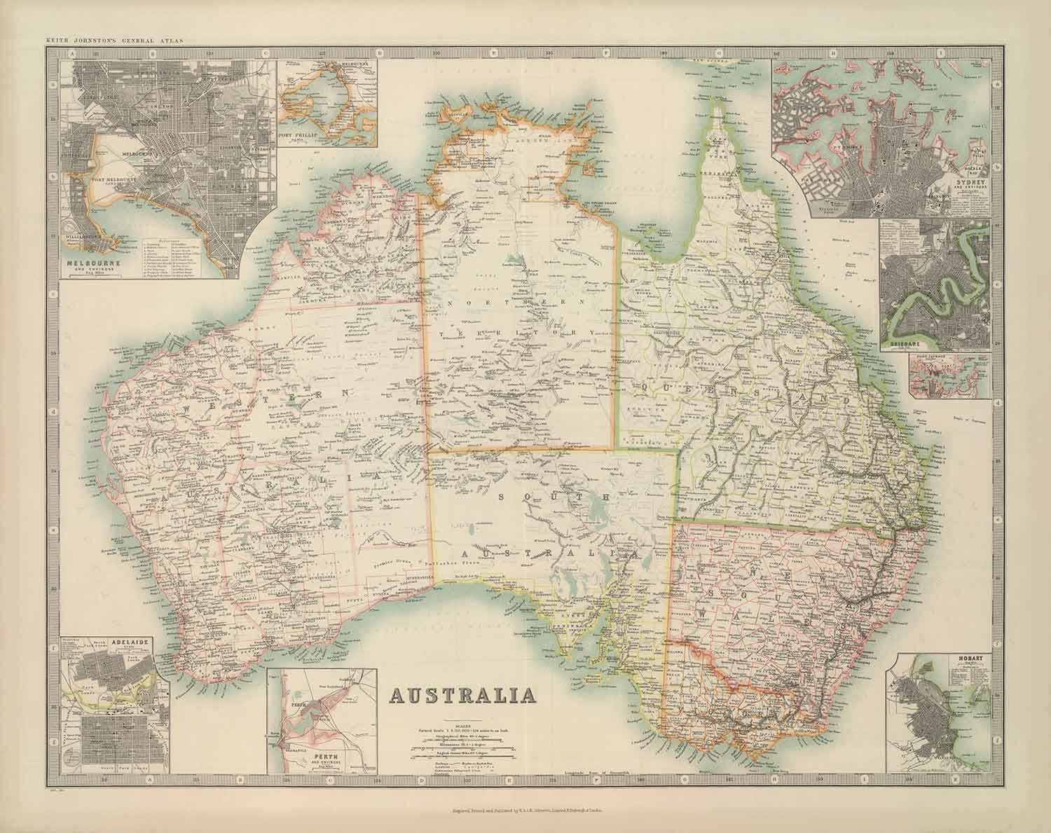 Un mapa precioso y altamente detallado de Australia, publicado originalmente en 1911 por uno de los mejores cartógrafos del siglo XX - Johnston de Edimburgo, Escocia.