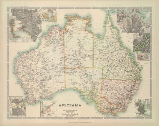 A lo largo de los bordes del mapa hay acercamientos a las ciudades más famosas de Australia, como Sídney, Melbourne, Adelaida, Perth, Brisbane, Puerto Jackson y Hobart. Como puedes ver, aunque la mayoría de las ciudades de Australia solo fueron fundadas en el siglo XIX, se desarrollaron muy rápidamente.