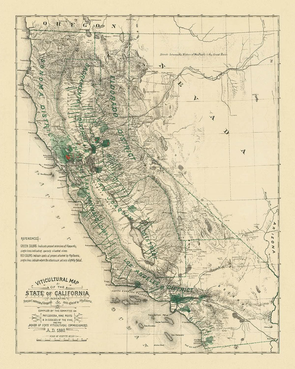 Este mapa muestra una variedad de distritos vitivinícolas, incluidas las famosas regiones de Sonoma y Los Ángeles, que están marcadas con intrincados detalles. Los tonos verdes simbolizan los viñedos florecientes, mientras que las marcas rojas indican las áreas donde la filoxera había hecho estragos. El diseño del mapa es funcional y estéticamente agradable, y ofrece una narrativa visual de los triunfos y las dificultades de la industria del vino. Sirve como testimonio de la importancia histórica de estas regiones, que siguen siendo fundamentales en el mundo de la producción de vino en la actualidad.