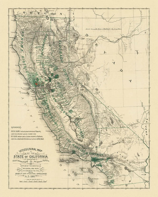 El "Mapa Vitícola del Estado de California que Indica la Extensión Actual de Viñedos y Lugares Afectados por la Filoxera" es una visión cautivadora de la floreciente industria vitivinícola de California a finales del siglo XIX. Elaborado en 1880 por el Comité sobre Filoxera, Plagas de la Vid y Enfermedades de la Vid para la Junta de Comisionados Vitícolas del Estado, este mapa no es solo un logro cartográfico sino también un documento histórico de inmensa importancia. Captura un período crítico en el que los viñedos de California se expandían, pero al mismo tiempo se veían amenazados por la devastadora plaga de la filoxera. El diseño temático del mapa, que utiliza tonos verdes y rojos, ilustra vívidamente las regiones de viñedos saludables y los afectados por esta plaga de la vid, ofreciendo una perspectiva única de los desafíos que enfrentaron los primeros viticultores.