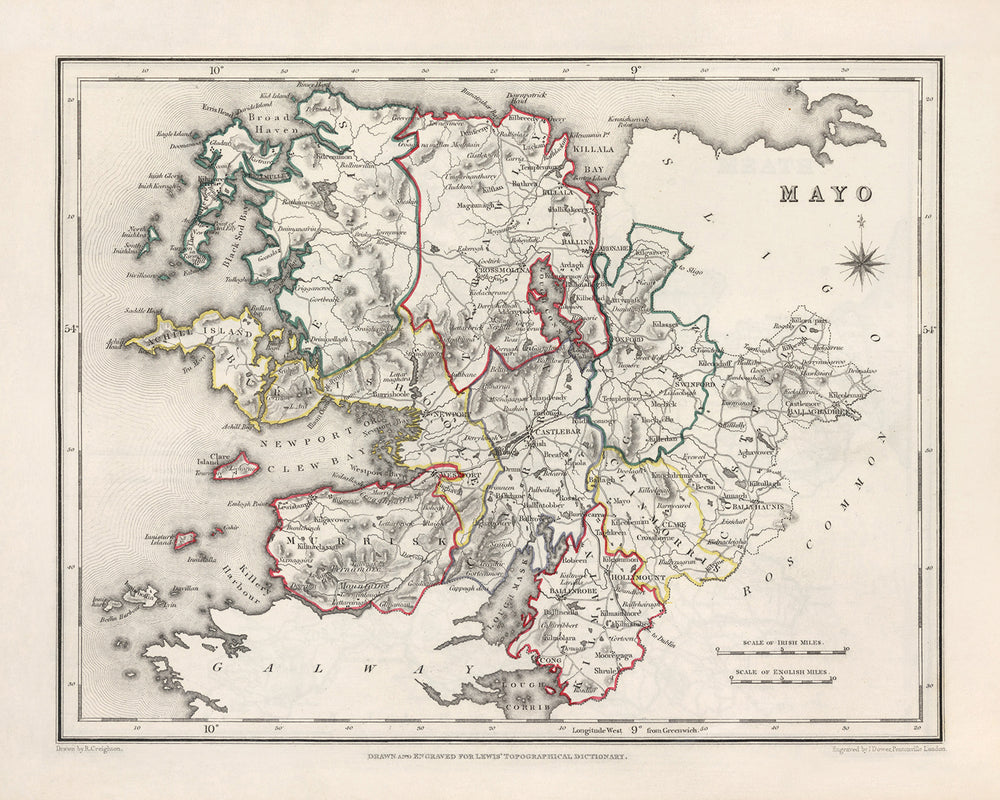 Mapa antiguo del condado de Mayo por Samuel Lewis, 1844: Westport, Ballina, Castlebar, Isla Achill, Clew Bay