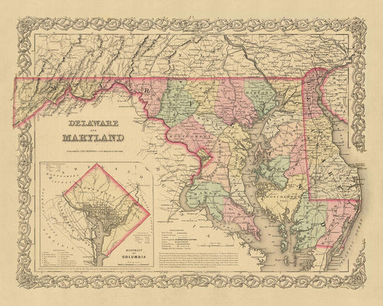 Esta pieza excepcional es un antiguo mapa de Delaware, Maryland y Washington DC, creado por el renombrado cartógrafo JH Colton en 1859. Colton es ampliamente reconocido como uno de los mejores cartógrafos estadounidenses de su época, y su meticulosa atención al detalle es evidente en esta hermosa representación de la región. El mapa se remonta a una época en la que Estados Unidos estaba en su infancia y la región aún estaba en gran medida inexplorada y subdesarrollada.