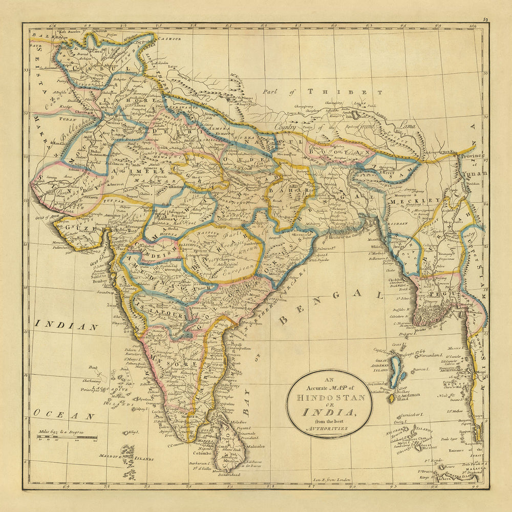El tema principal del mapa es India, pero también proporciona una representación detallada de las regiones circundantes, incluyendo Hindostán, Ceilán, Birmania, las Islas Andamán y la Bahía de Bengala. Estas áreas están representadas con notable precisión, reflejando el compromiso de Carey con la exactitud y el detalle. El estilo del mapa es tanto político como físico, ofreciendo una visión integral de las fronteras políticas y los paisajes físicos de la región. El resultado es una representación ricamente estratificada que proporciona una gran cantidad de información sobre la geografía y el paisaje político de la región.