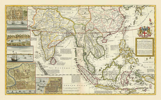 Grabados en primer plano de las principales ciudades y puertos en Bantam, Goa, Surat, Madrás y Batavia se muestran en el borde izquierdo del mapa, y si miras de cerca, hay muchas ricas anotaciones que describen la influencia colonial europea en la región.