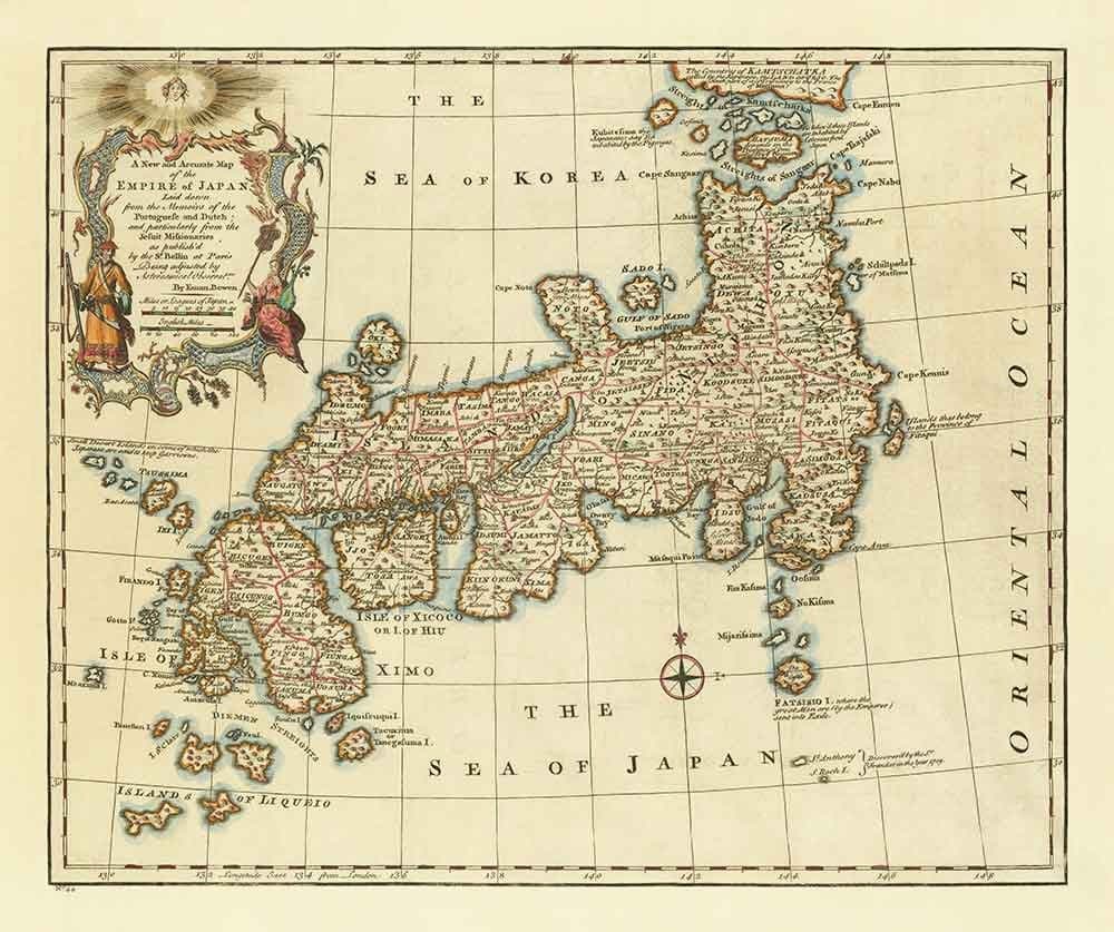 Antiguo mapa de Japón realizado por Bowen en 1744: Tokio, Kioto, Osaka, Honshu, Shikoku, Kyushu, Kamchatka, Asia Oriental