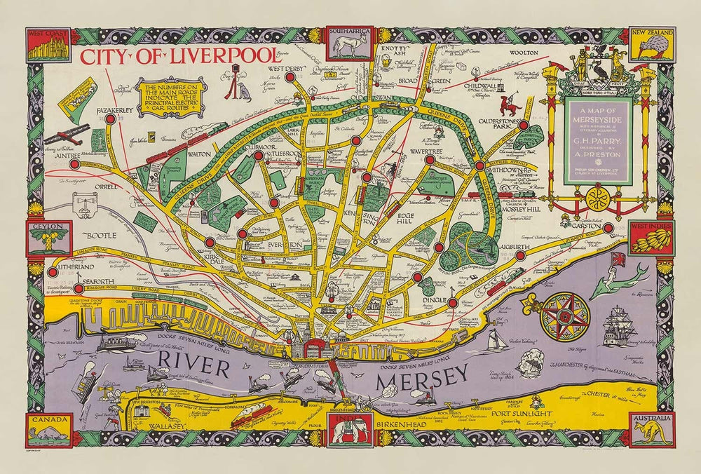 Este hermoso y absolutamente único mapa pictórico de Liverpool fue publicado en 1934 por GH Parry.