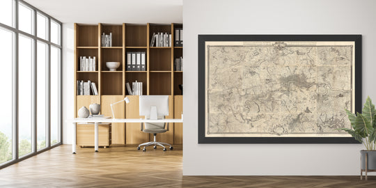 La mayoría de los mapas, arte e ilustraciones también están disponibles como un lienzo enmarcado. Utilizamos lienzo de algodón mate (no brillante), lo estiramos sobre un marco de madera de caja de origen sostenible, y luego 'flotamos' la pieza dentro de un marco de madera. El resultado final es bastante hermoso, y no hay cristal que se interponga.