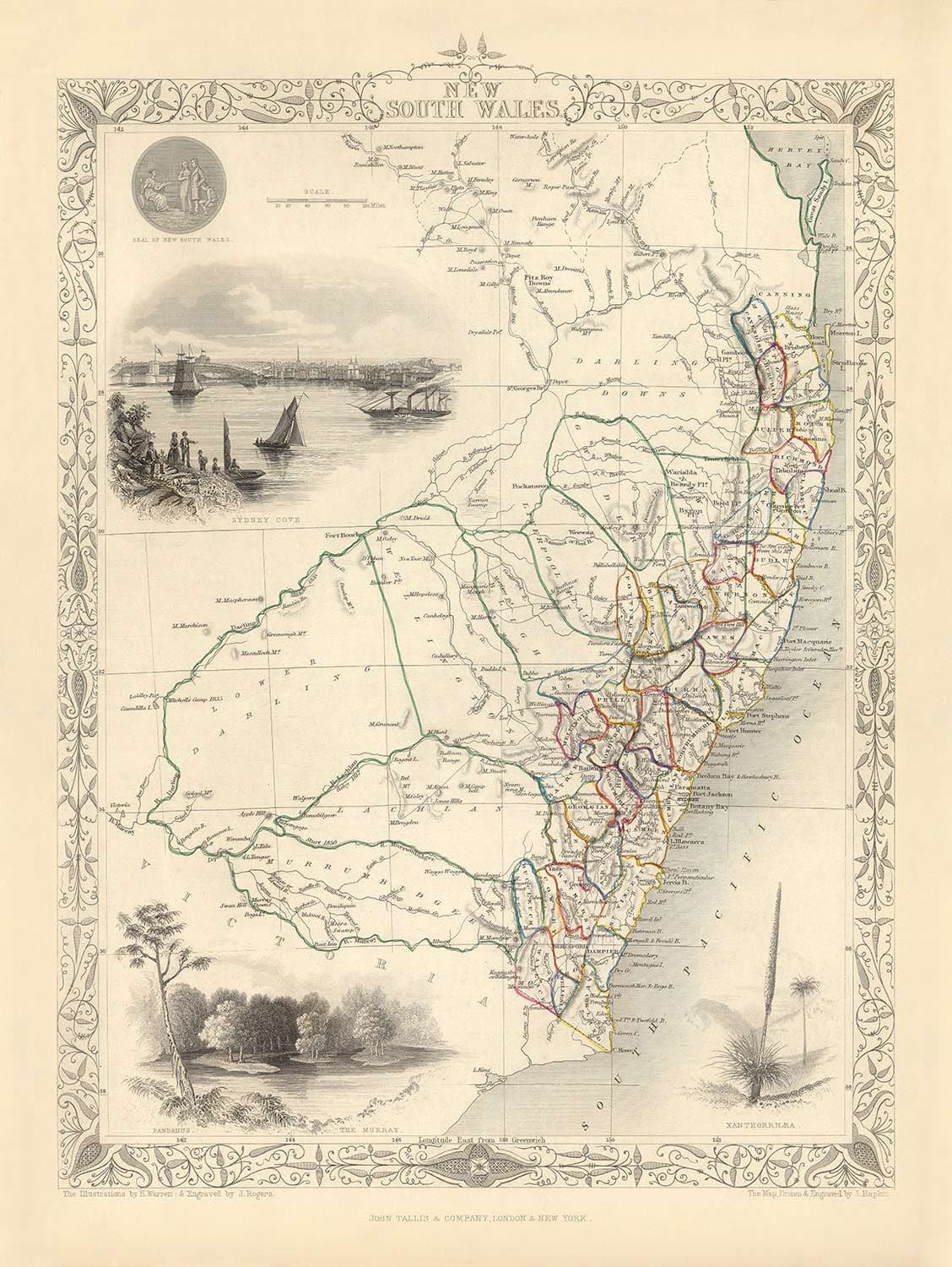 Antiguo mapa de Nueva Gales del Sur, Australia 1851 por Tallis & Rapkin: Sydney, Newcastle, Brisbane, Botany Bay, condados de NSW