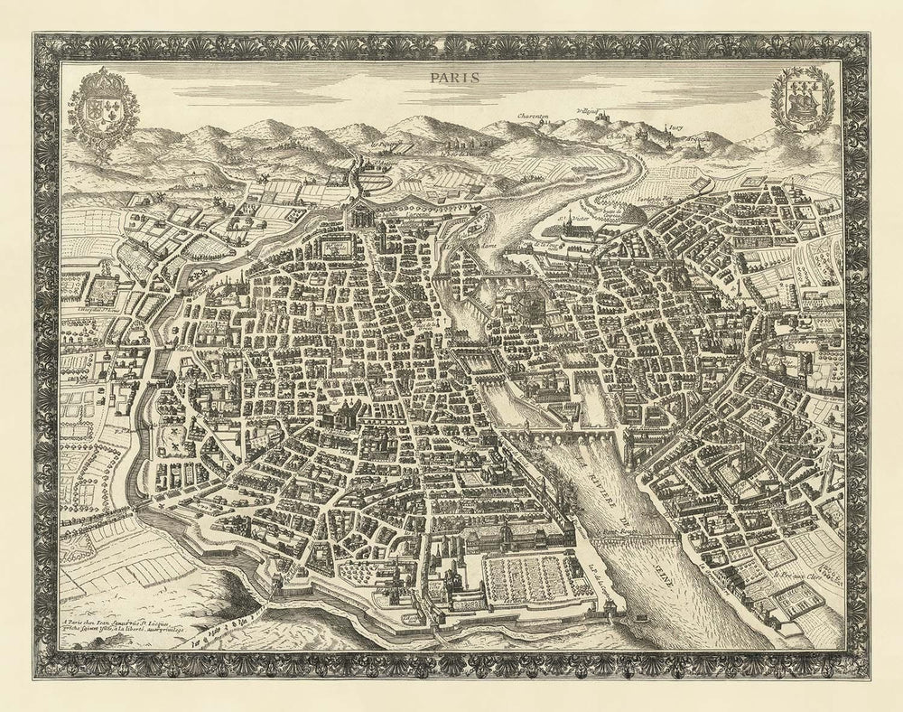 Notablemente, por supuesto, Notre Dame y Saint-Chapelle en la Île de la Cité ya se habían construido. Y la Bastilla está allí, junto con algunas otras iglesias y palacios. El Sena, por supuesto, serpentea a través del medio del mapa.