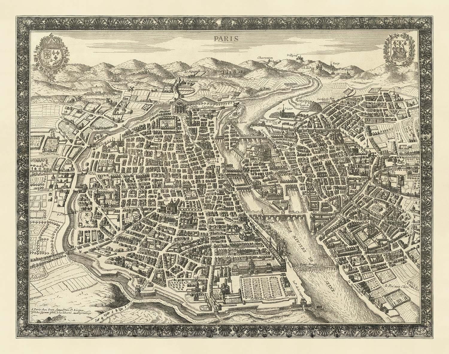 Viejo Mapa de París, Francia de Jean Sauve en 1670: Notre Dame, Sainte-Chapelle, Isla de la Cité, Bastilla