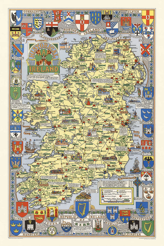 El "Mapa histórico de Irlanda" se distingue por su representación detallada de los escudos de armas de las principales ciudades y pueblos de Irlanda, una característica que añade una capa de significado heráldico y atractivo visual. Este elemento decorativo, junto con la cobertura completa del mapa de catedrales, abadías, castillos y lugares de batalla, ofrece una ventana al tejido histórico y cultural de Irlanda. Cada símbolo e ilustración se elige cuidadosamente para representar el enfoque temático de la historia, lo que convierte al mapa en una guía colorida e informativa del pasado histórico de Irlanda.