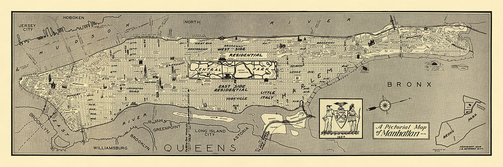- El mapa proporciona una instantánea de Manhattan en 1939, capturando el diseño de la ciudad y las características notables de esa época.