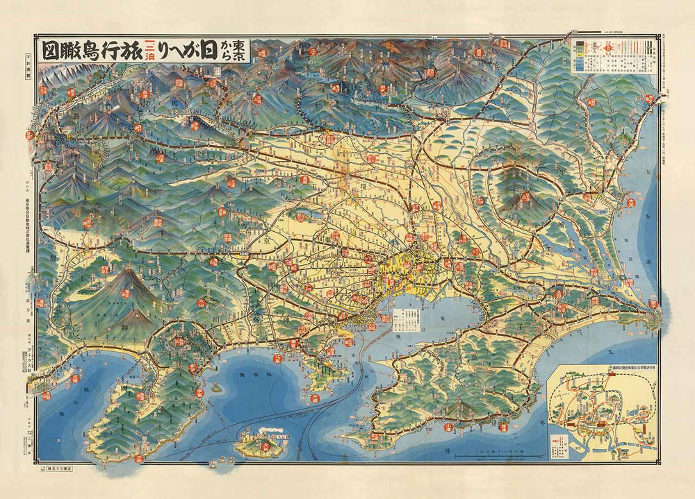 Este mapa pictórico de principios del siglo XX, etiquetado completamente en escritura japonesa, muestra Tokio y sus áreas circundantes. Durante este tiempo, cinco suburbios y distritos rurales fueron absorbidos y fusionados en la Ciudad de Tokio. Como resultado, se crearon 20 nuevos distritos, llevando el total a 35, conocido como Gran Tokio.