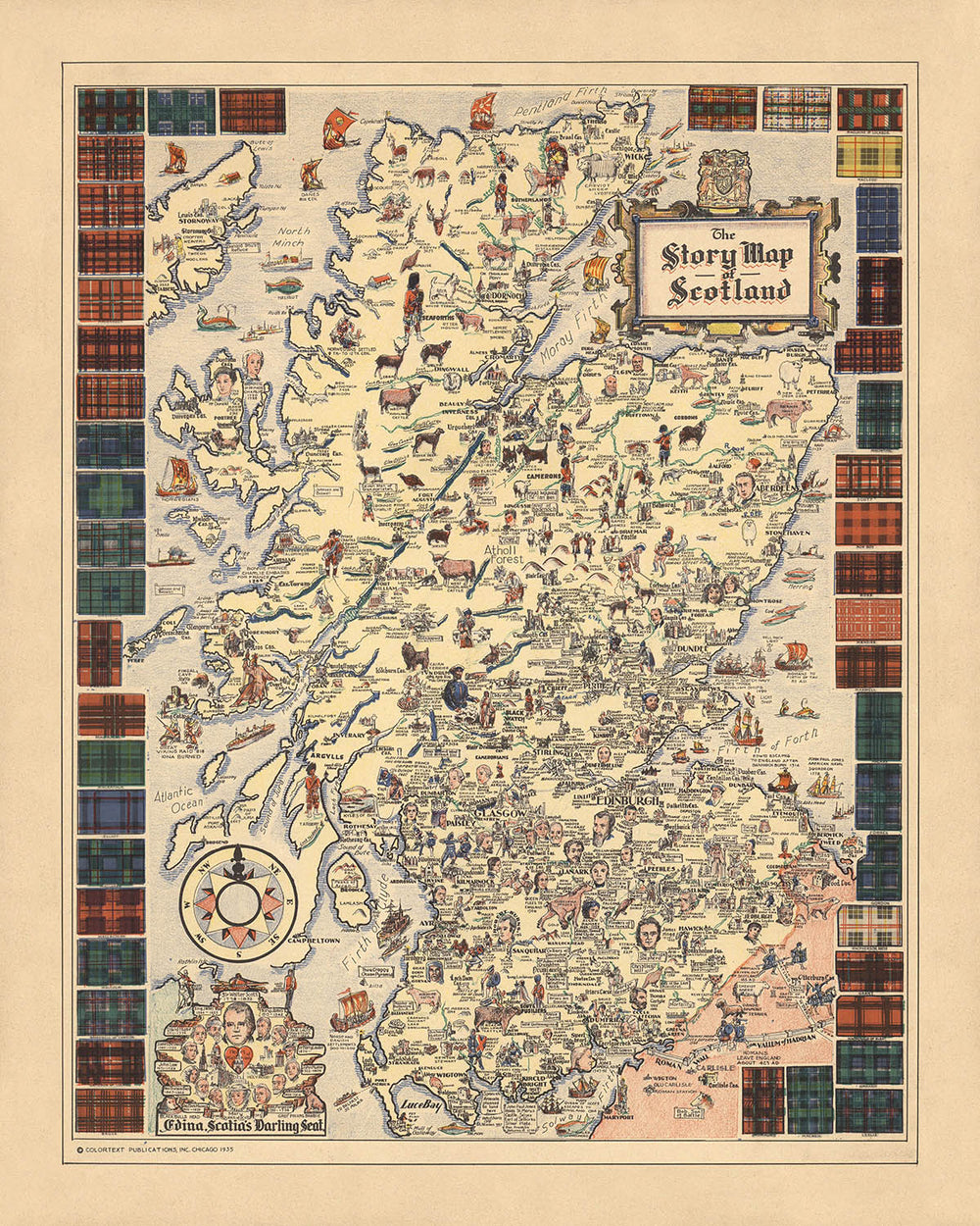 El "Mapa histórico de Escocia", elaborado por Colortext Publications en 1935, es una combinación cautivadora de arte y narrativa histórica. Este mapa pictórico es un tesoro escondido de la herencia escocesa, que captura la esencia del pasado histórico de la nación a través de vívidas ilustraciones y viñetas detalladas. Las publicaciones Colortext, reconocidas por sus mapas educativos e ilustrativos, han diseñado meticulosamente esta pieza para ofrecer tanto deleite visual como visión histórica. El mapa está adornado con retratos de personajes históricos importantes, como Flora MacDonald y Bonnie Prince Charlie, que dan vida a los relatos de la tumultuosa historia de Escocia.
