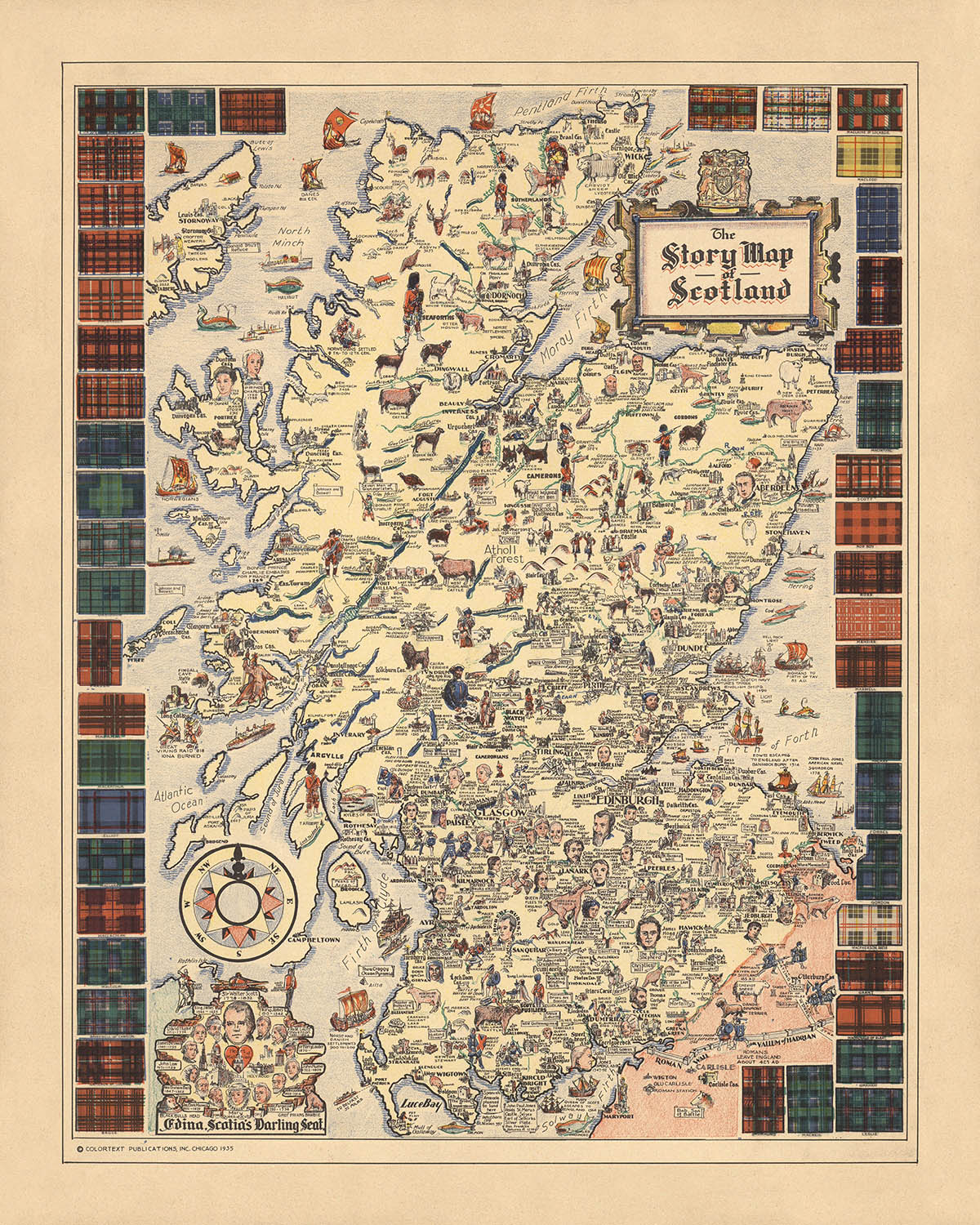 - Pictórico y temático: El mapa está ricamente ilustrado con viñetas y tartán, lo que lo hace informativo y visualmente atractivo.
