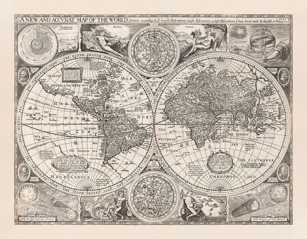 En 1651, nuestra comprensión del mundo no era lo que es hoy. ¡California es una isla! Y no hay Antártida ni Australia, solo la 'Tierra Desconocida del Sur'. Echa un vistazo más de cerca a América del Norte y verás algunos asentamientos muy tempranos, incluyendo algunos que han sido completamente fabricados por el cartógrafo. ¿Y por qué América del Norte se desvía salvajemente hacia el oeste en la esquina superior?