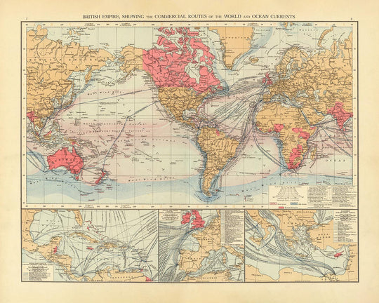 El mapa es un testimonio del inmenso alcance del Imperio Británico y ofrece una representación detallada de los continentes de Europa, Asia, América del Norte, América del Sur, África y Australia, así como las vastas extensiones del Pacífico, Atlántico y Océanos Índicos. Las rutas comerciales están meticulosamente marcadas, lo que demuestra la extensa red que facilitó el intercambio de bienes, ideas y culturas en todo el mundo. Las Islas Británicas, el corazón del imperio, ocupan un lugar destacado, junto con las colonias de Canadá, India, Australia y Nueva Zelanda. Cada una de estas regiones está representada con sus principales ciudades y puertos, los centros de actividad comercial durante este período.